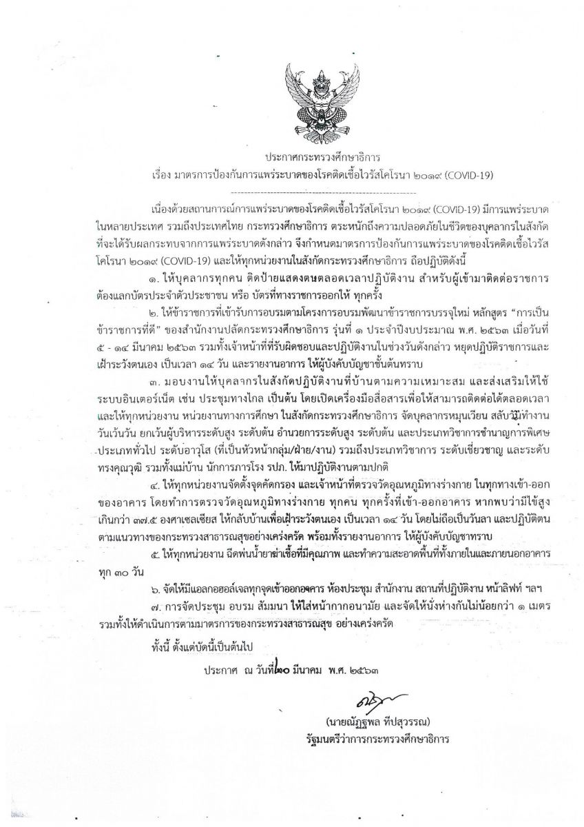 ประกาศกระทรวงศึกษาธิการ เรื่อง มาตรการป้องกันการแพร่ระบาดของโรคติดเชื้อไวรัสโคโรนา 2019 (COVID-19)
