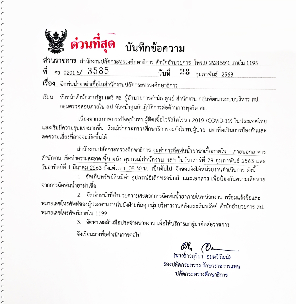 (วันเสาร์ที่ 29 ก.พ. และอาทิตย์ที่ 1 มี.ค.63) สำนักงานปลัดกระทรวงศึกษาธิการ จึงได้ดำเนินการฉีดพ่นน้ำยาฆ่าเชื้อภายในและภายนอกอาคารสำนักงาน พร้อมทั้งเช็ดทำความสะอาดพื้น ผนัง อุปกรณ์สำนักงานต่าง ๆ ทุกพื้นที่ในบริเวณ ศธ. เพื่อป้องกันการแพร่ระบาดเชื้อไวรัส COVID-19 อีกทั้งยังได้ให้บริการเจลล้างมือประจำหน่วยงาน เพื่อให้บริการแก่ผู้มาติดต่อราชการไว้ด้วยแล้ว